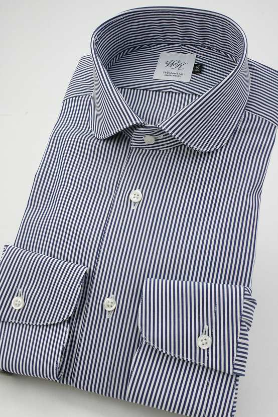 カフスシングルカフス(カーブドカフス)/コバステッチバックヨークスプリットヨーク&バック両サイドにダーツベースカラーネイビー×ホワイト ロンドンストライプ素材綿100%イージーアイロン easy iron素材特徴滑らかな手触りの上質な ポプリン 生地。