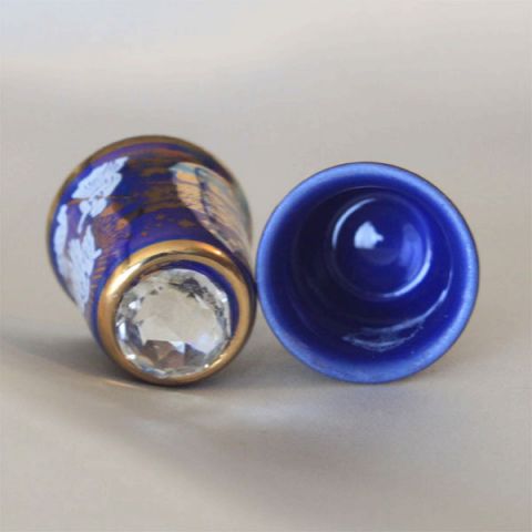 紺の地にゴールドとホワイトで描かれ、虹色の輝くラスター仕上げ、 トップにはスワロフスキーの大きなクリスタルを冠しています。
