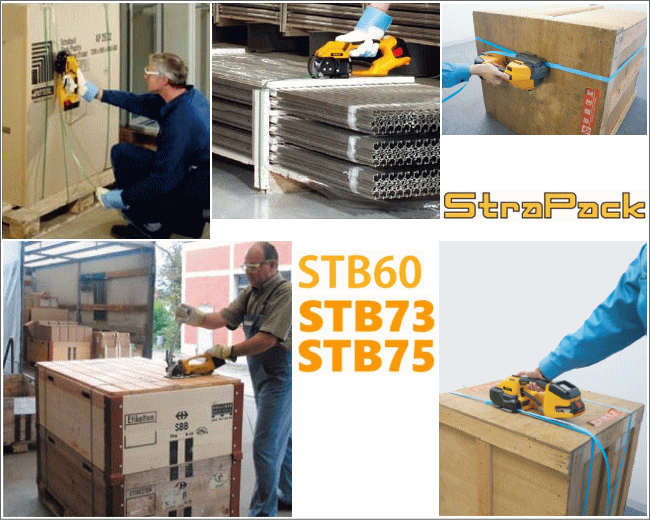 StraPack コードレスハンディ梱包機 STB75 [自動式] ■特徴■ ・使用バンドはPPバンド、PETバンド、ヘビーバンドと幅広いく対応できます。